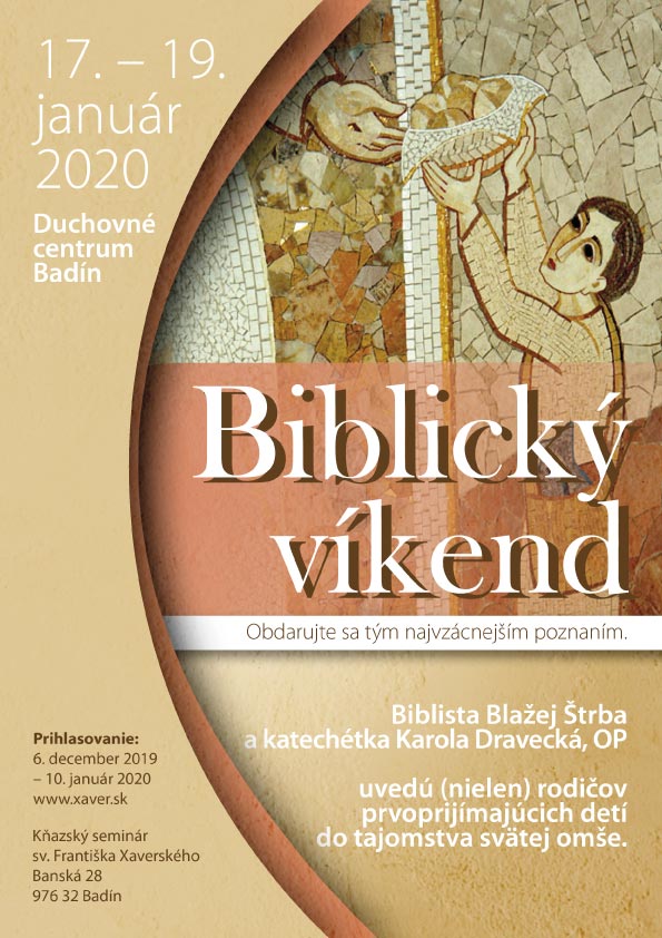 V Duchovnom centre Badín sa v termíne 17. - 19. januára 2020 uskutoční biblický víkend (nielen) pre rodičov provoprijímajúcich detí, manželské páry či jednotlivcov. Je zameraný pre tých, ktorí chcú obdarovať seba samých a svoje deti tým najkrajším darom poznania Božej prítomnosti medzi nami – Eucharistie – vo svetle Božieho slova.