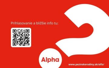 V spolupráci s Centrom pre rodinu - Pezinok, o.z. vám ponúkame Alfa kurz pre dospelých. Alfa kurz je pre všetkých, ktorí otvorene radi premýšľajú o viere, Bohu, zmysle života. Je pre tých, ktorí chcú spoznať alebo prehĺbiť svoju kresťanskú vieru. Ide o neformálne stretnutia pri občerstvení, krátkych videoprednáškach a priateľských diskusiách.